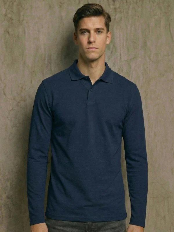 Чоловіча теніска B&C з довгим рукавом у темно-синьому кольорі виготовлена з попередньо усадженої бавовни ring-spun у фактурі piqué. Щільність 180 г/м² забезпечує зручність і стабільну форму, а довгі рукави роблять модель практичною у прохолодні дні. В’язаний комір та посилена планка на двох ґудзиках додають структурності, підкреслюючи класичний стиль теніски.